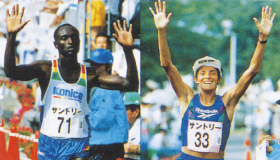 レースは男女ともスタートからスローペースで、男子はもっとも期待された川嶋選手は35㌔付近で棄権、田幸選手も16位、結局一般参加選手のエリック・ワイナイナ選手(コニカ)が2時間15分03秒であっさり優勝をさらってしまった。また、女子は昨年8位と不本意な結果に終わったオルガ・アペル選手(米国)が’94ロスマラソン優勝の実力をまざまざと見せつけ、昨年の雪辱を果たした。