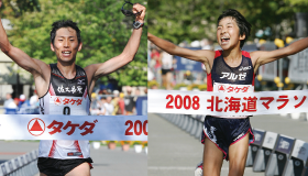 男子は前半、15㌔付近から下森直選手(安川電機)が飛び出してリードしたが、ペースが落ちた30㌔すぎにケニア出身のジュリアス・ギタヒ選手(日清食品)が追いつき、35㌔すぎにスパートをかけ後続を引き離し、2時間17分26秒でフィニッシュ。フルマラソン初挑戦で優勝を飾った。